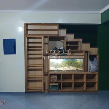 1 Sala de Estar com porcelanato, estante planejada, aquário decorativo e jardim de inverno com cascata