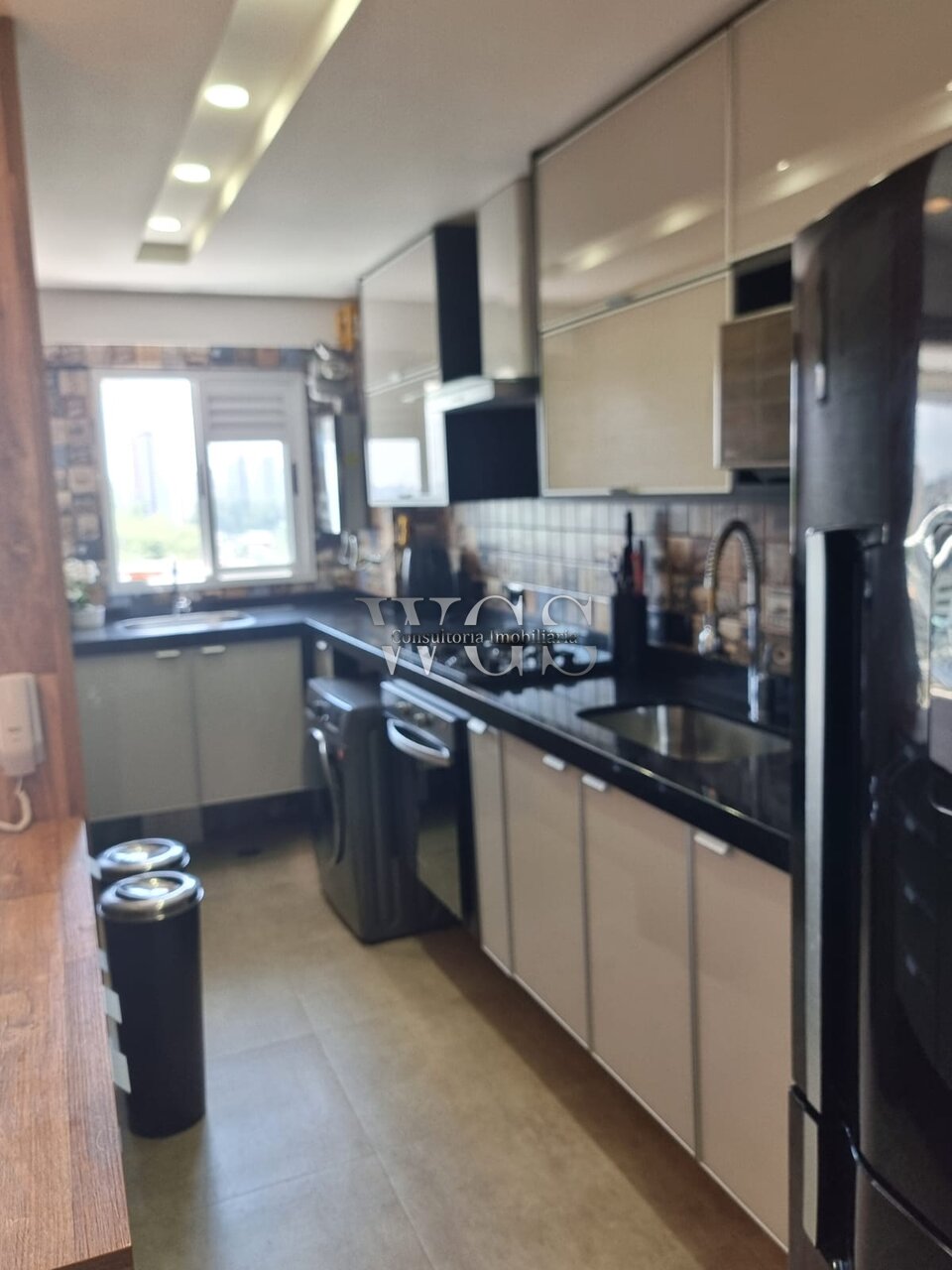 Cozinha americana integrada à sala, com armários planejados e bancada em granito